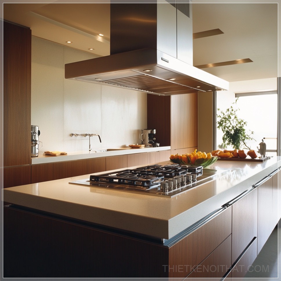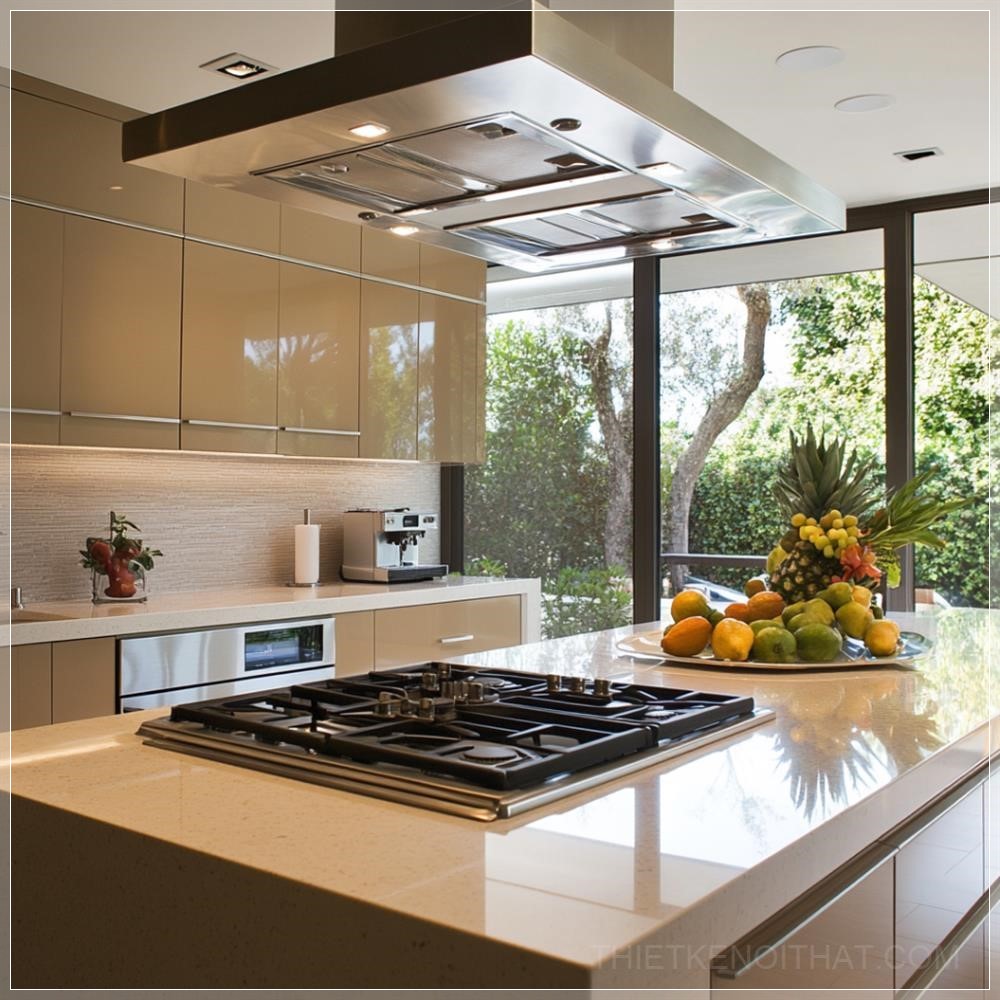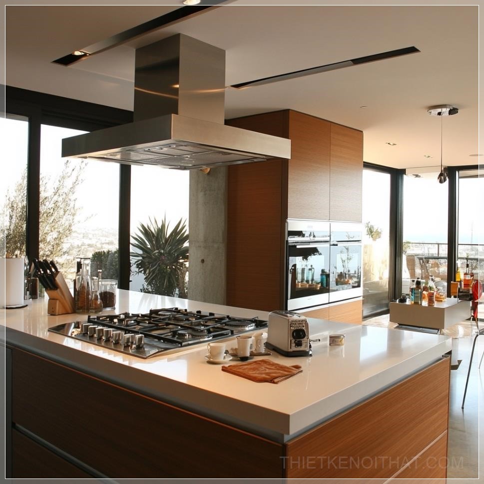 Gian bếp hiện đại được thiết kế với phong cách tinh tế và tiện nghi. Điểm nhấn nổi bật là chiếc máy pha cà phê Miele sang trọng, tạo nên không gian lý tưởng cho những buổi sáng thư giãn. Bếp nấu được đặt ngay trên đảo bếp lớn, mang lại sự thuận tiện trong quá trình chế biến món ăn. Đặc biệt, đảo bếp không có bồn rửa, giúp giữ được sự gọn gàng và thẩm mỹ. Thay vào đó, bồn rửa được bố trí dọc theo tường, kết hợp hài hòa với hệ tủ bếp hiện đại và không gian lưu trữ tối ưu. Tổng thể gian bếp mang lại cảm giác rộng rãi, sáng sủa và đậm chất đương đại.