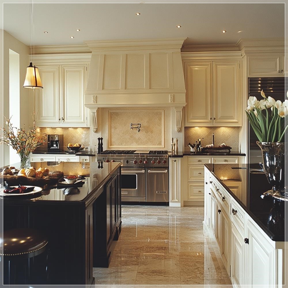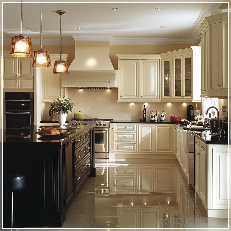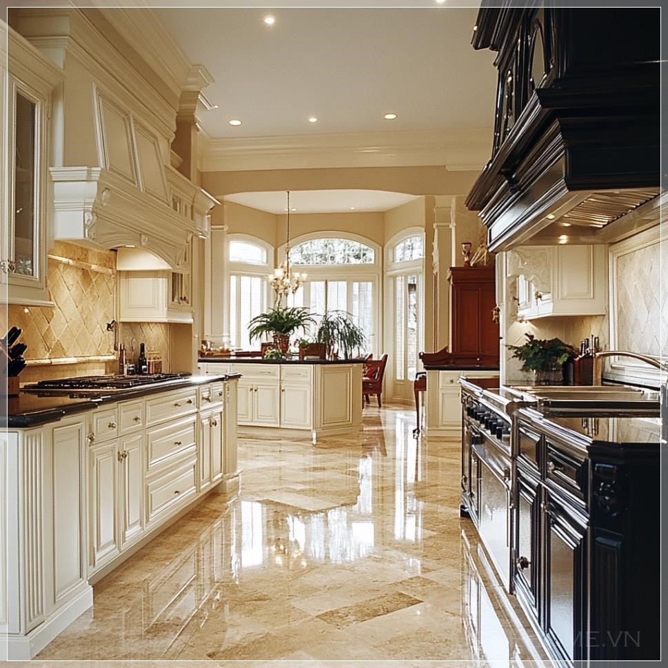 Cảnh quay từ tầm mắt của một căn bếp sang trọng với tông màu kem, nâu và đen....