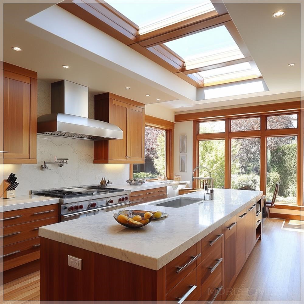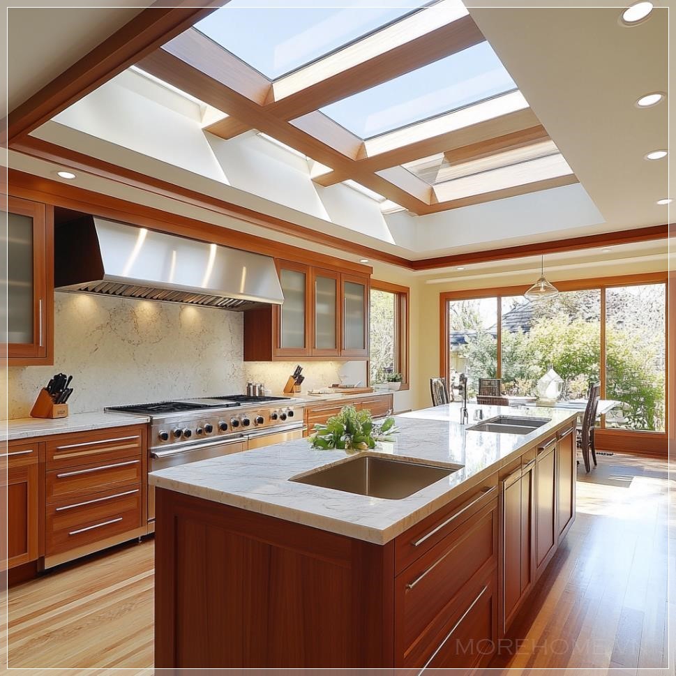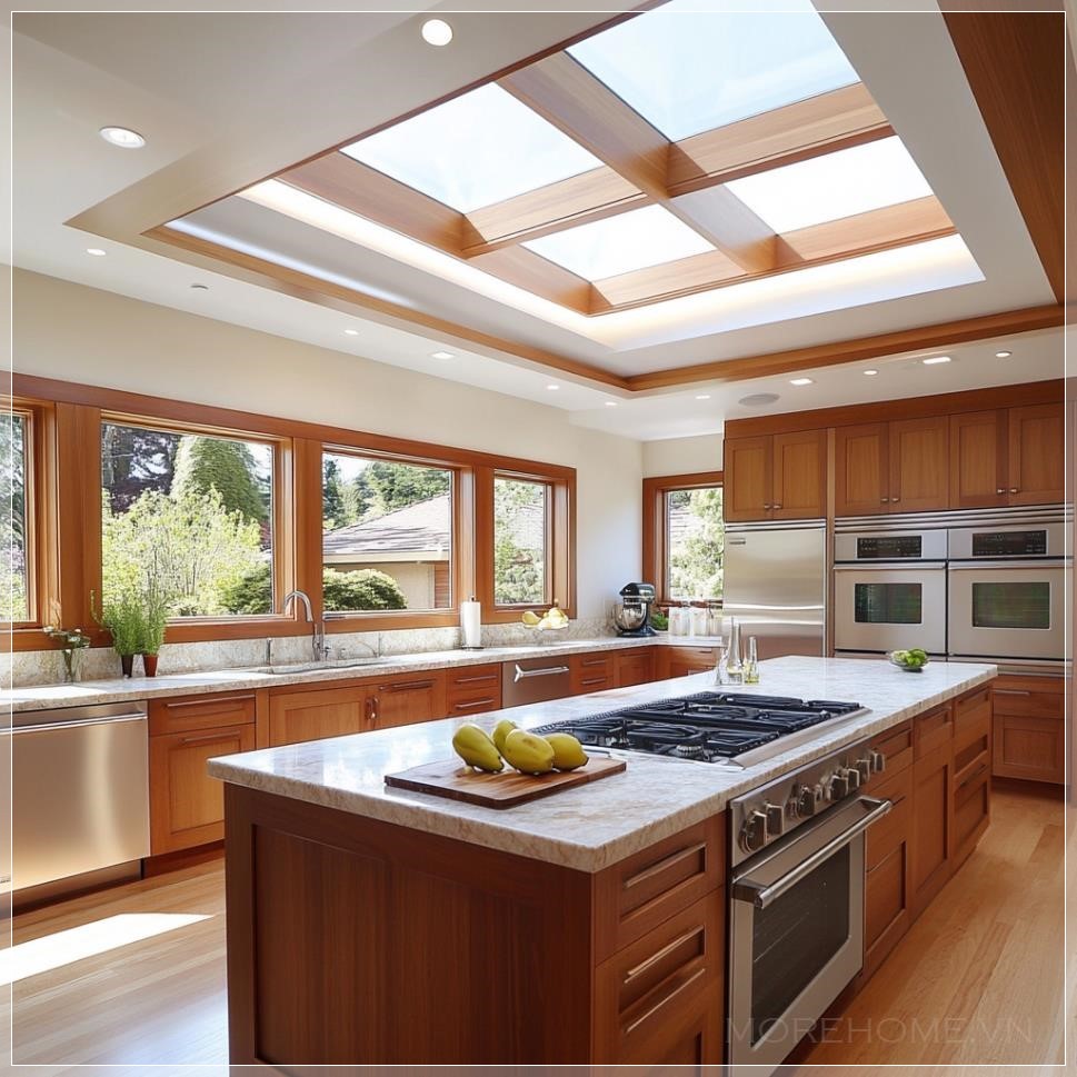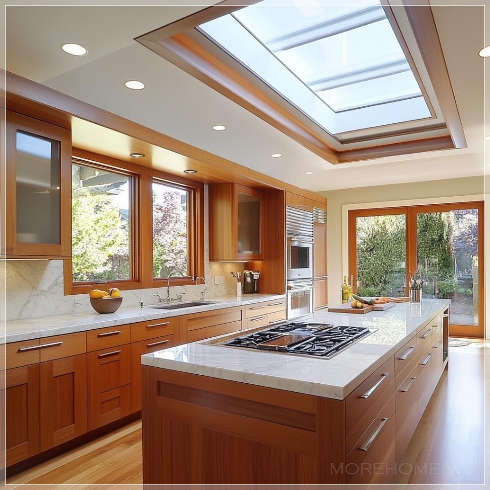 Bếp hiện đại lớn, trần nhà có thiết kế tray, cửa sổ mái hình chữ nhật trên trần, đảo bếp lớn ở giữa, tủ bếp với mặt phẳng màu nâu sáng đất, mặt bàn bếp bằng đá cẩm thạch và tường ốp đá cẩm thạch, sàn gỗ tự nhiên màu gỗ gụ sáng, một hàng cửa sổ phía trên bồn rửa bát, tất cả các chân tường và viền cửa sổ đều bằng gỗ gụ, tường và trần nhà màu trắng sữa, các thiết bị chrome độc đáo, đèn chiếu sáng tạo điểm nhấn, chủ đề sáng.
