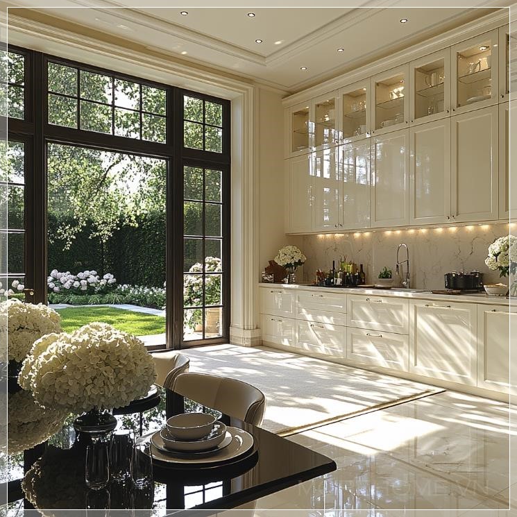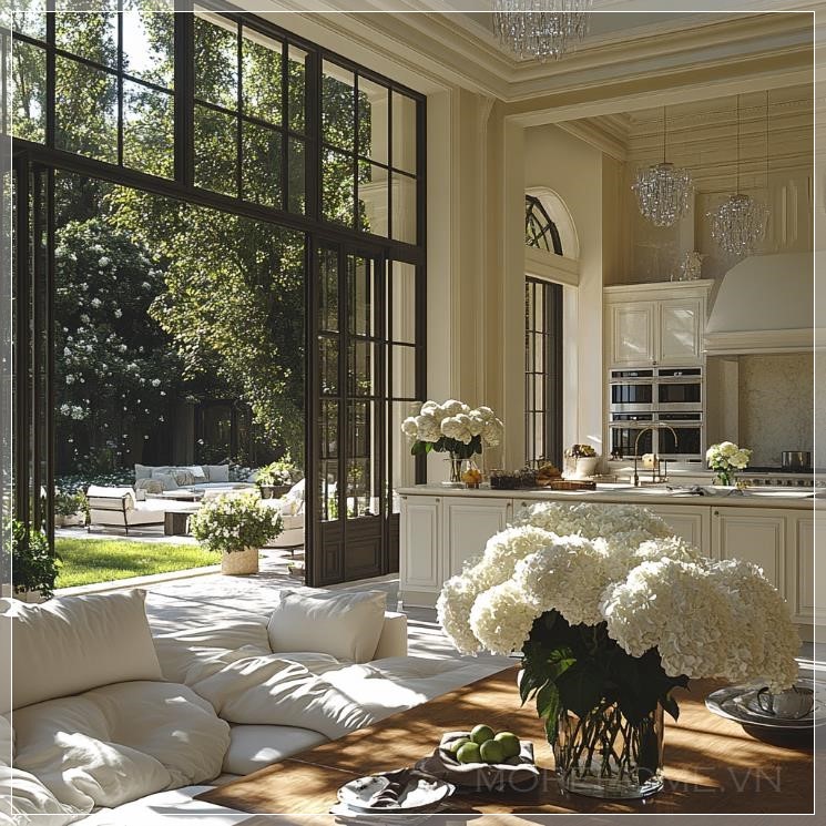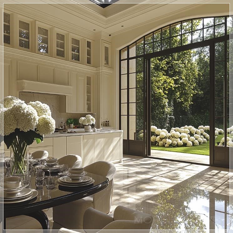 Thêm một chiếc bàn ăn rất lớn và dưới bàn ăn là một tấm thảm trắng, bếp villa hiện đại màu trắng tại Kensington Parc, cửa mở ra khu vườn thanh lịch với một thảm cỏ xanh rộng lớn và rất nhiều hoa cẩm tú cầu trắng thanh nhã, rất chi tiết, nhiều hoa cẩm tú cầu trắng trong khu vườn thanh lịch, bầu trời xanh, màu kem, trắng và đen, rất chi tiết, siêu thực, chụp ảnh 4k và độ phân giải cao hơn.