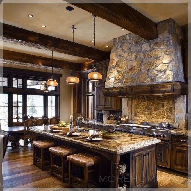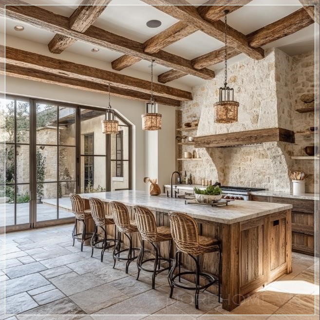 Nhà bếp rustic, tông màu đất, xà gỗ và điểm nhấn đá....