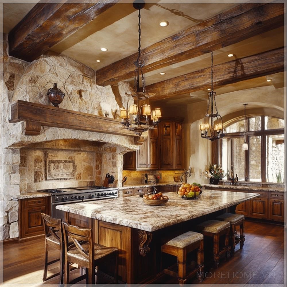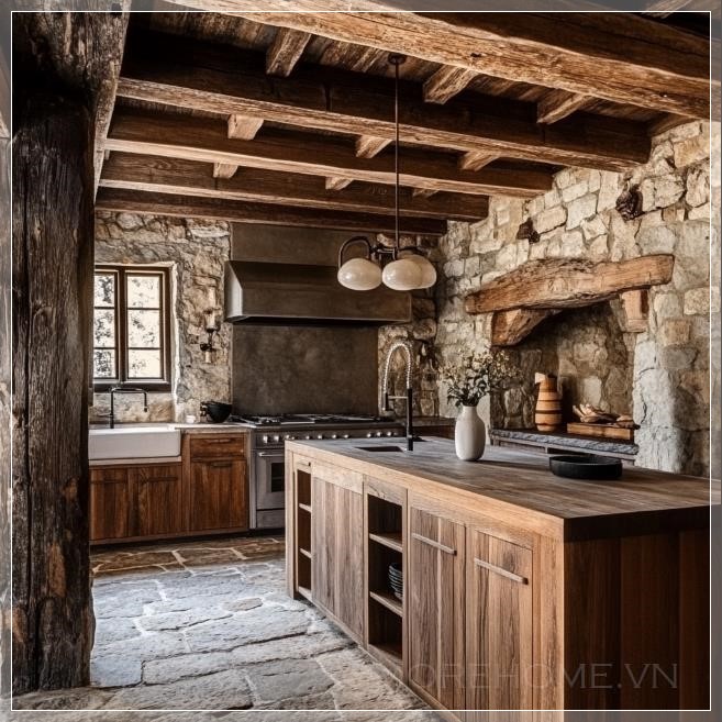 Nhà bếp rustic, tông màu đất, xà gỗ và điểm nhấn đá.