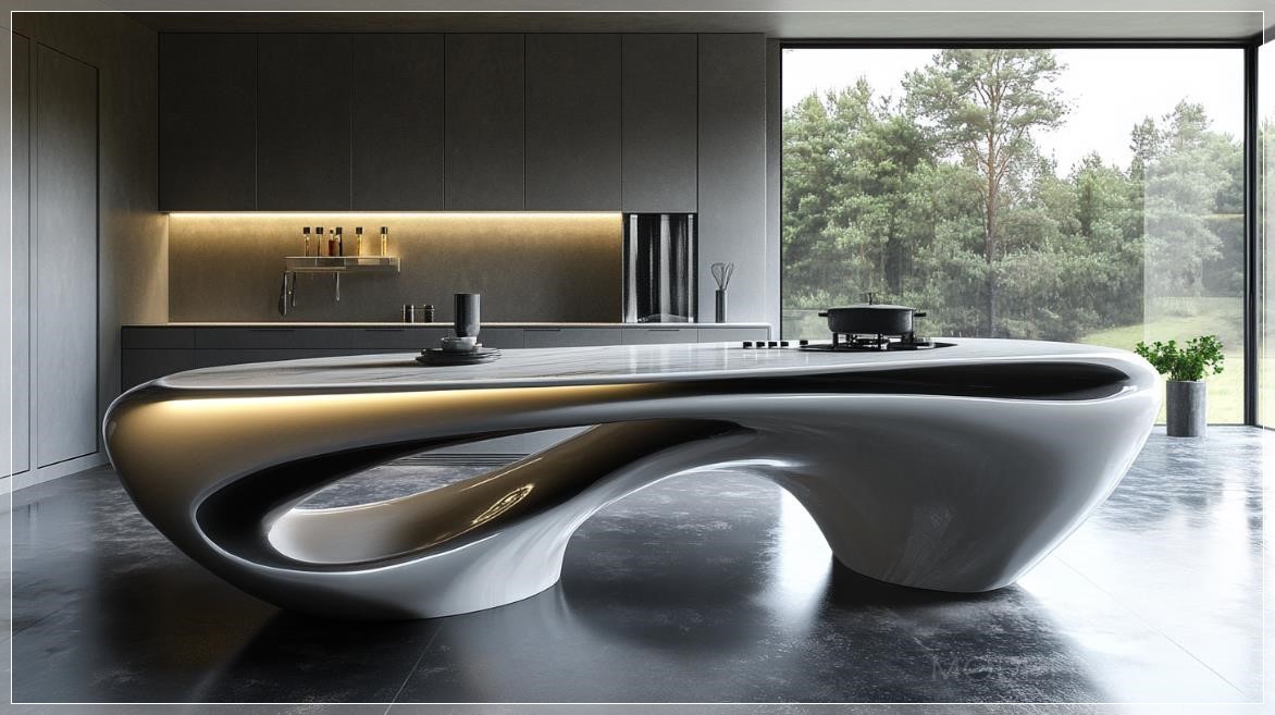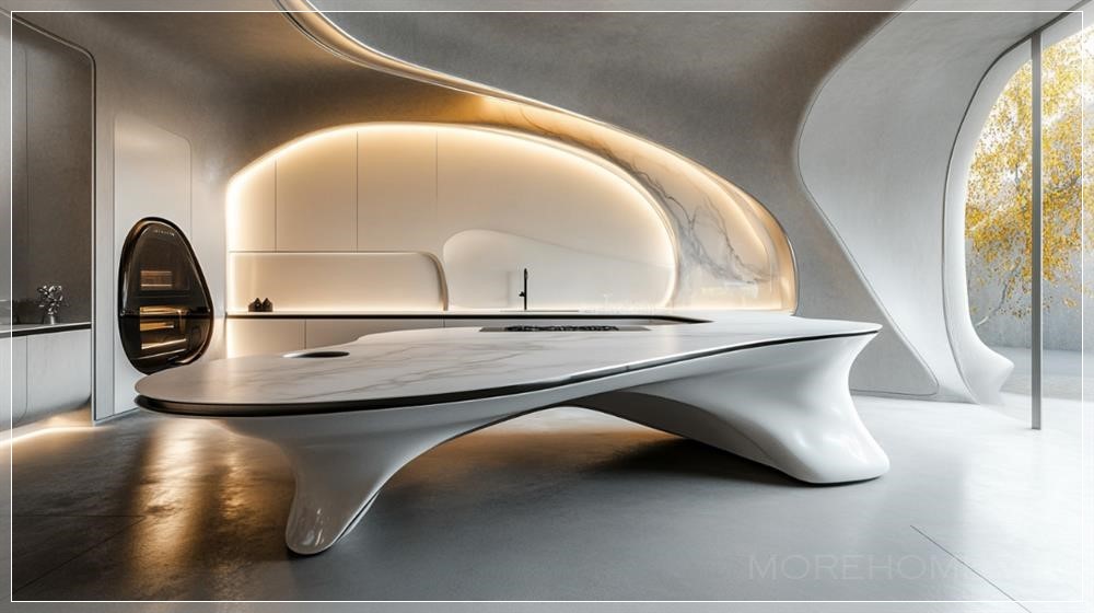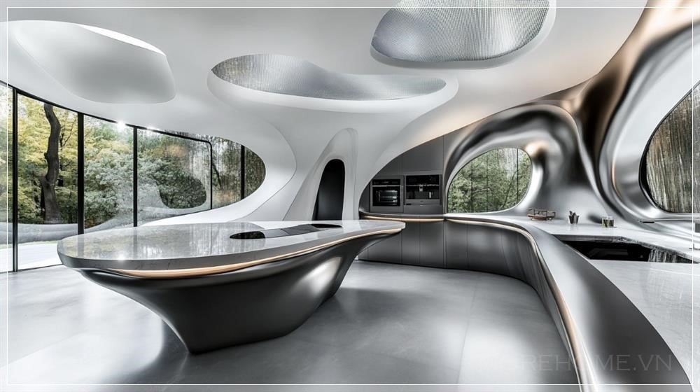 Nhà bếp hiện đại tương lai, được thiết kế theo phong cách Zaha Hadid, với những đường cong uyển chuyển, các đường nét mượt mà và hình dạng điêu khắc táo bạo. Không gian mở và thoáng đãng, với một dòng chảy hữu cơ kết hợp liền mạch với các thiết bị công nghệ cao và tủ bếp tối giản. Mặt bàn và đảo bếp được làm từ các vật liệu mịn màng, sáng bóng như đá cẩm thạch và bê tông, với ánh sáng nhẹ nhàng làm nổi bật các hình dạng động. Bố cục của nhà bếp mang tính sáng tạo và bất đối xứng, tạo ra cảm giác chuyển động, trong khi các giải pháp lưu trữ tích hợp tinh tế duy trì một thẩm mỹ gọn gàng, không có sự lộn xộn. Những cửa sổ lớn cho phép ánh sáng tự nhiên tràn ngập không gian, làm tăng thêm bầu không khí tương lai.