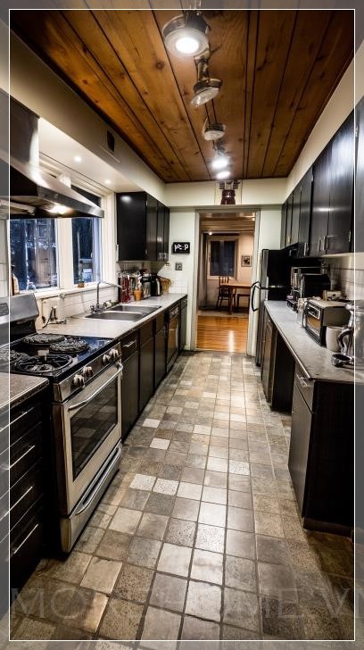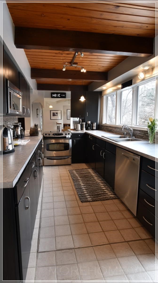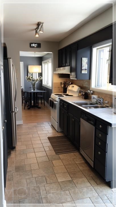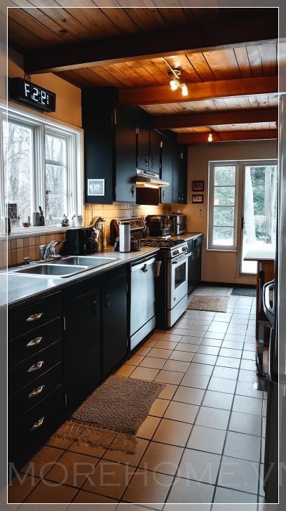 Nhà bếp cũ, tủ đen, sàn gạch granite, thiết bị gia dụng cổ điển, ánh sáng mờ, không gian ấm cúng, phong cách mộc mạc.