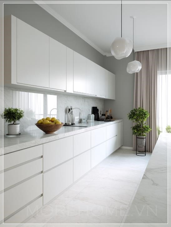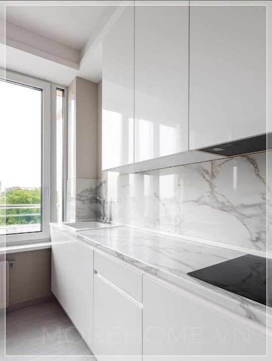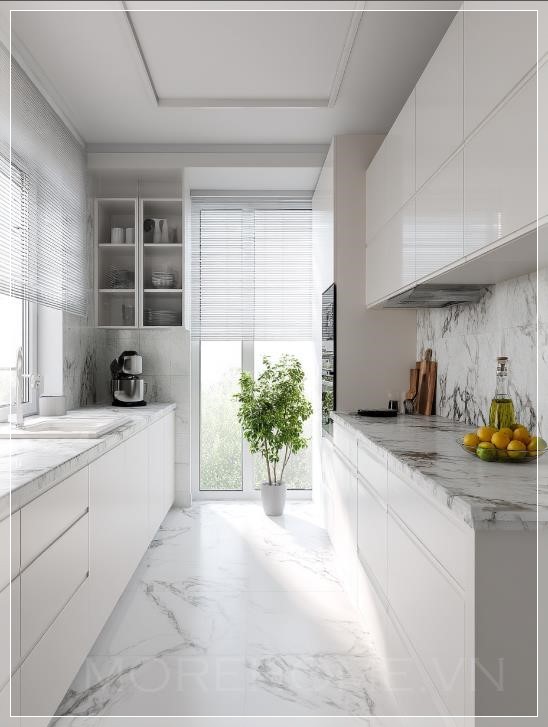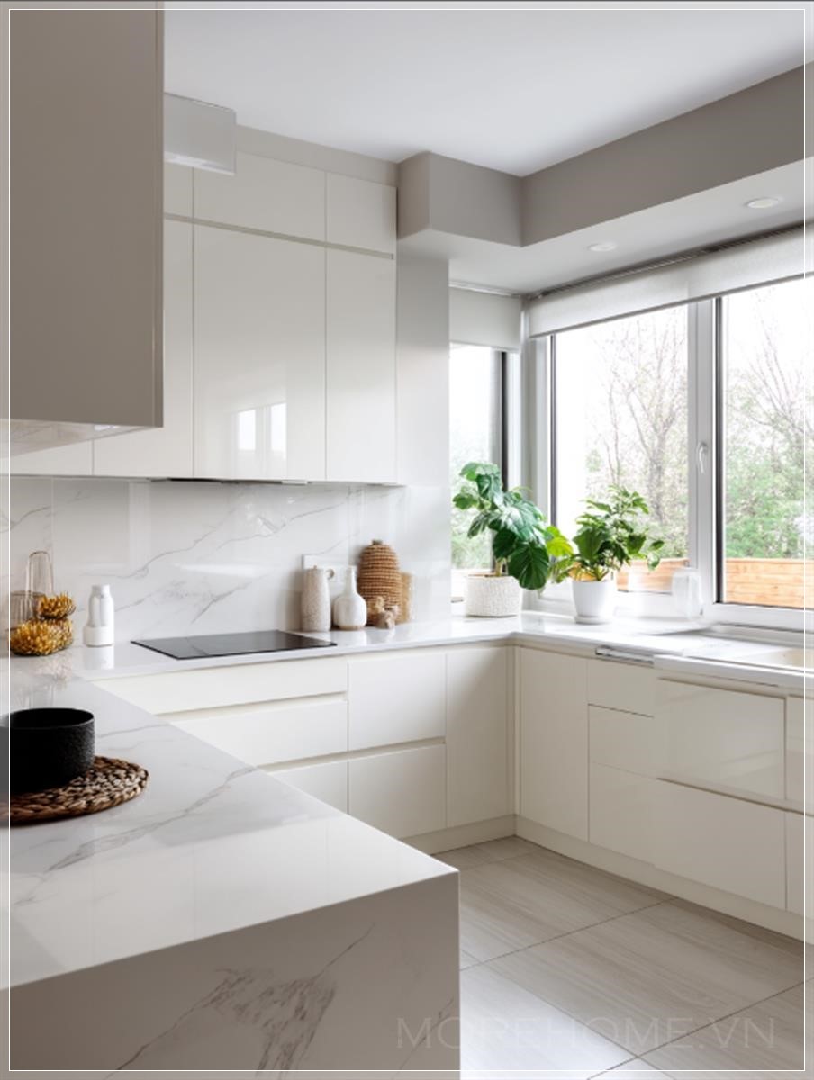 Nội thất bếp hiện đại tối giản với tủ bếp trắng, mặt bàn đá cẩm thạch, ánh sáng tự nhiên nhẹ nhàng, phong cách Scandinavian, mang lại vẻ đẹp tinh tế và thanh thoát.