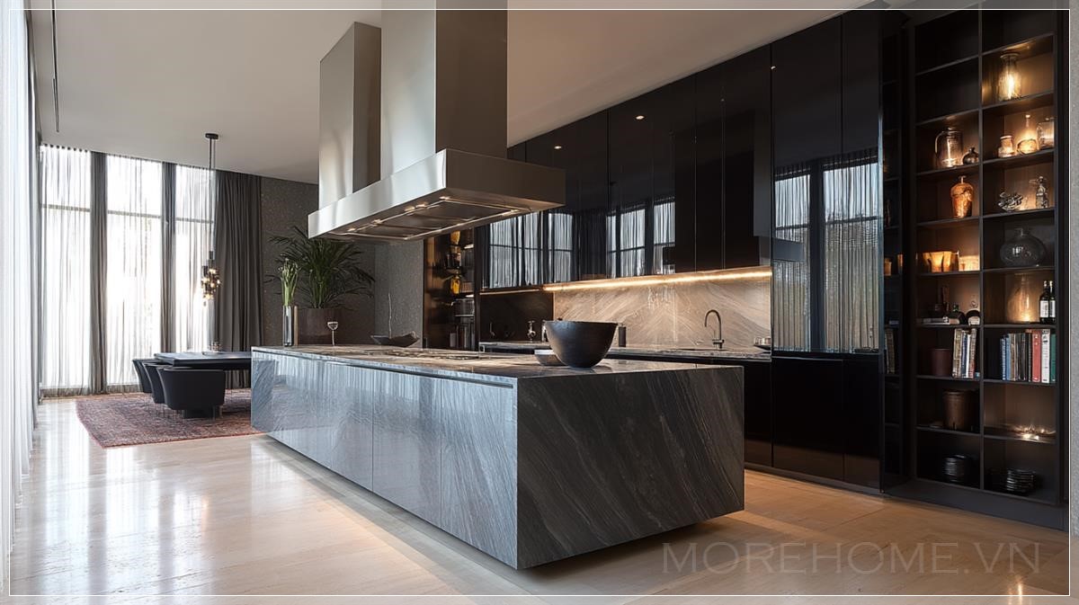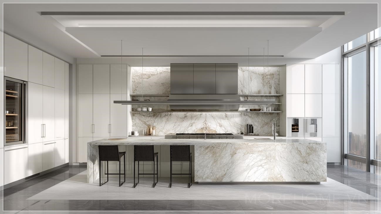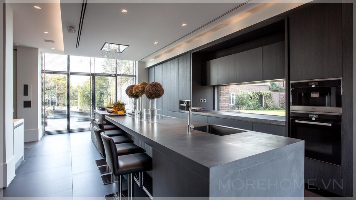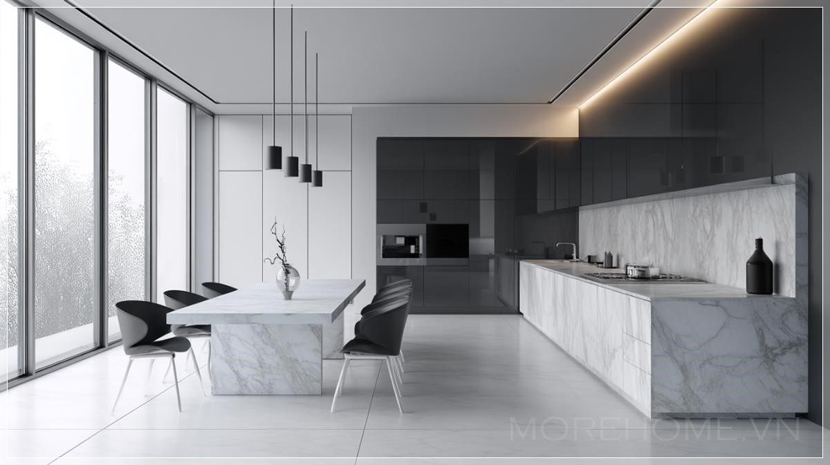 Bếp tối giản, chất lượng cao cấp, thiết kế hiện đại với các đường nét sạch sẽ và tối giản. Bề mặt bếp sử dụng vật liệu cao cấp như đá quartz và thép không gỉ, tạo nên không gian sang trọng và tinh tế. Các tủ bếp không tay cầm với thiết kế gọn gàng, tạo sự thông thoáng và thoải mái. Ánh sáng tự nhiên ngập tràn qua các cửa sổ lớn, kết hợp với ánh sáng từ đèn treo tạo ra bầu không khí ấm cúng và hiện đại. Tất cả chi tiết được chọn lựa tỉ mỉ để mang đến một không gian bếp đẳng cấp, hoàn hảo cho những người yêu thích sự tối giản và sang trọng.