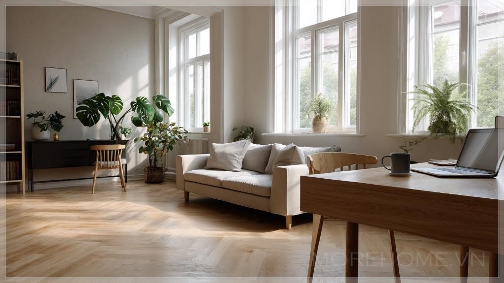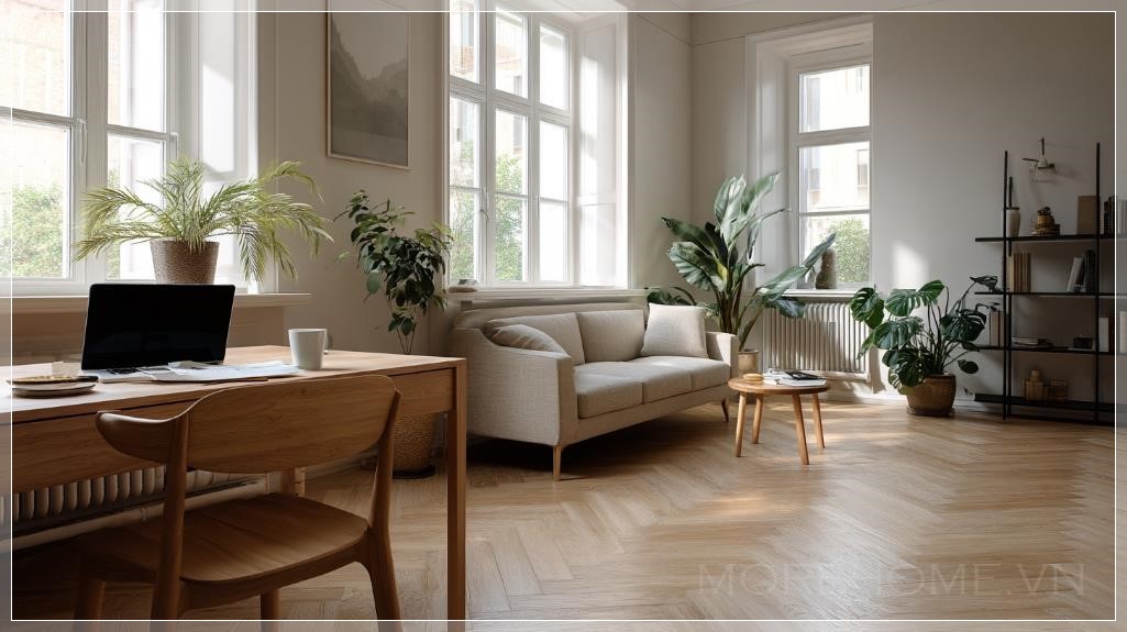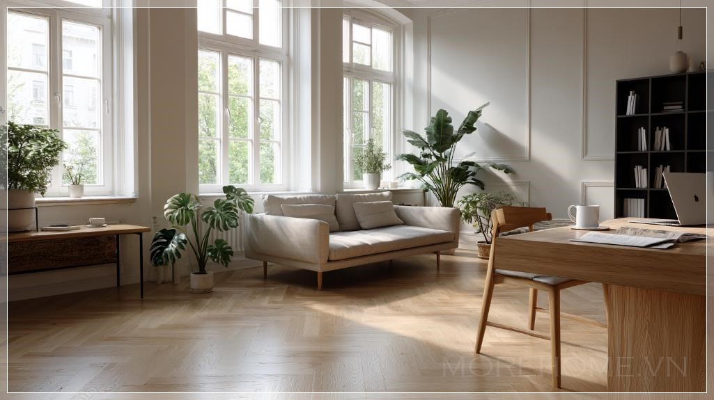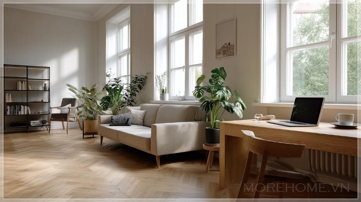 Nội thất studio chụp ảnh rộng rãi và hiện đại, góc nhìn bên trái, với sàn gỗ xương cá màu tự nhiên ấm, bàn làm việc đơn giản bằng gỗ với laptop, cốc cà phê và tạp chí mở. Gần cửa sổ lớn là một chiếc ghế sofa màu sáng, kệ sách tối giản màu đen, và một tủ bên thanh lịch được bố trí thành một góc cà phê. Các cây cảnh trong nhà như Monstera và cây vả lá hình nhạc được đặt một cách tinh tế. Ánh sáng tự nhiên nhẹ nhàng chiếu vào phòng, tạo ra một không gian yên tĩnh, ấm cúng. Thẩm mỹ tinh tế, thanh thoát và thư giãn.