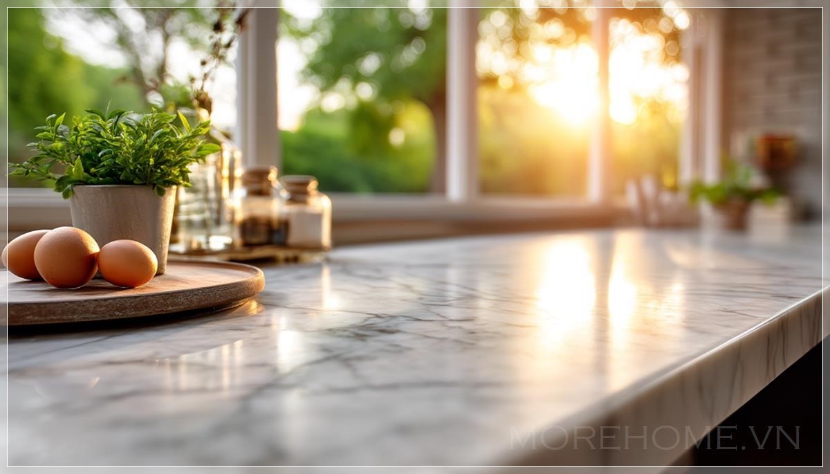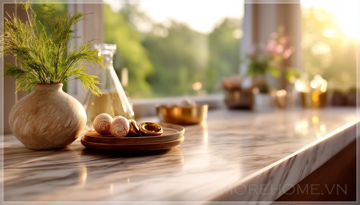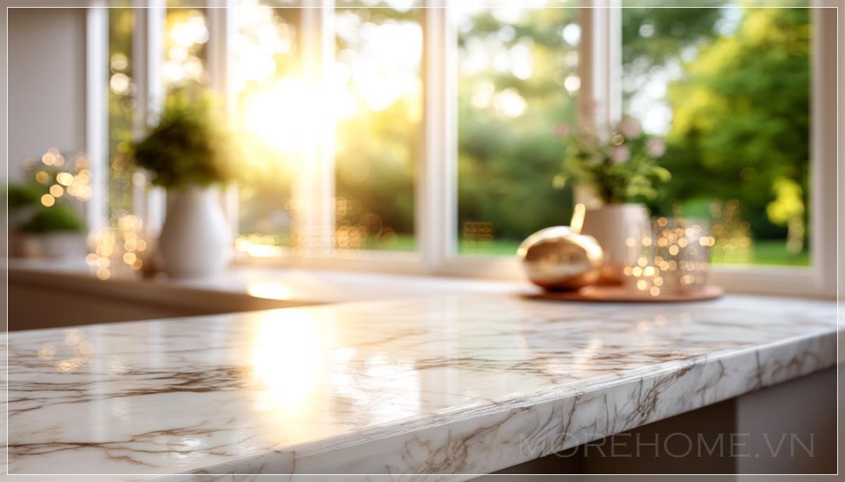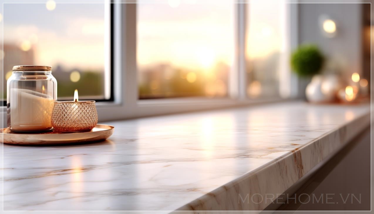 Một mặt bàn Carrara đá cẩm thạch trống không với các đường vân mềm mại, ngập tràn ánh sáng buổi sáng ấm áp từ một cửa sổ lớn không nhìn thấy. Độ sâu trường ảnh nông làm cho phần trước nét sắc nét trong khi phần phía sau mờ dần thành bokeh màu kem. Màu sắc trung tính trắng và xám với sự ấm áp của ánh hoàng hôn. Lý tưởng cho việc trình bày thực phẩm, đồ trang sức hoặc trang trí nhà cửa. Phong cách tạp chí bếp chuyên nghiệp.